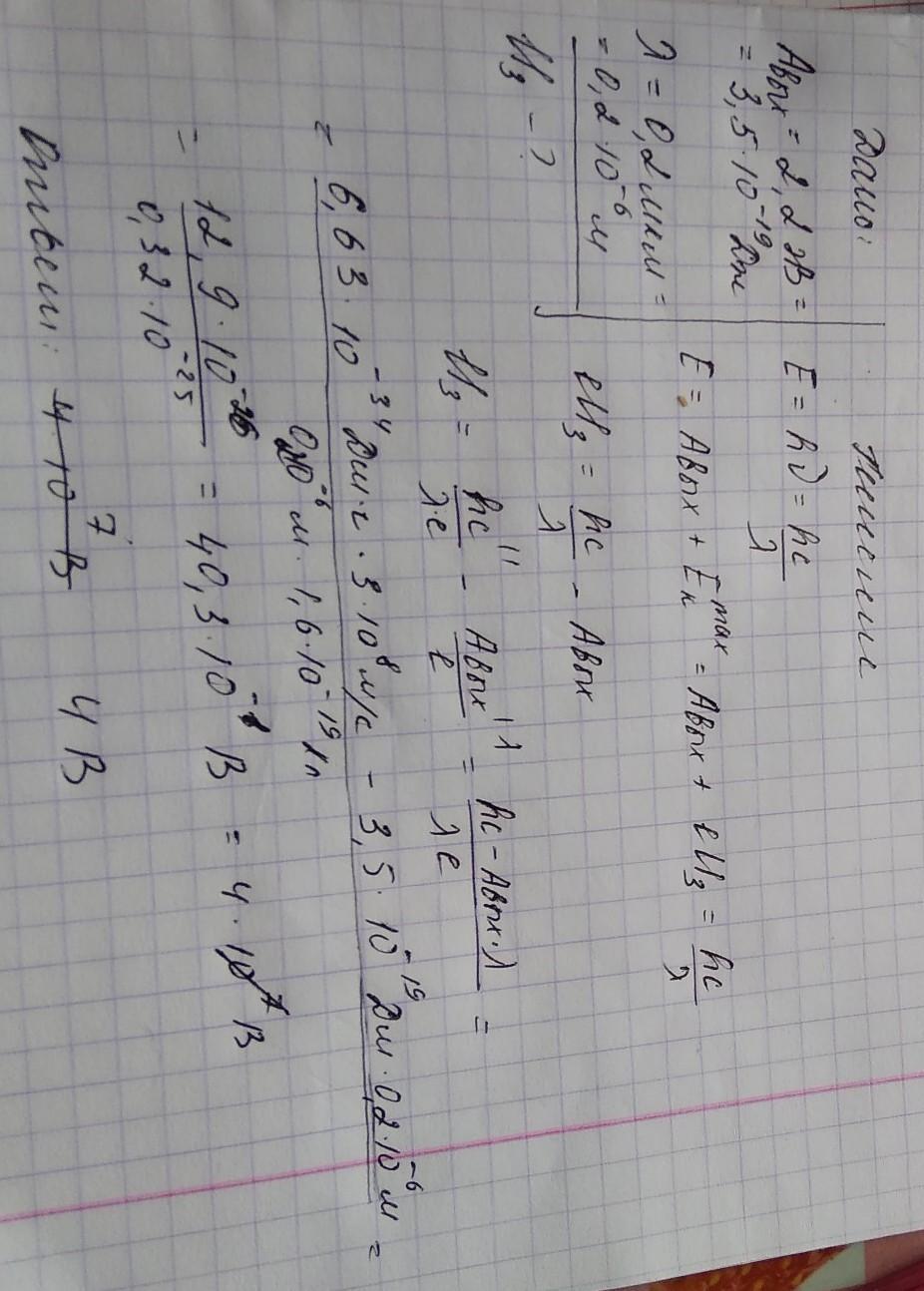 На поверхность калия, работа выхода электрона из которого 2,2 эВ падает свет с длиной волны 0,2 мкм. Найти наименьшее значение задерживающей напряжения, при котором фотоэффект прекращается.