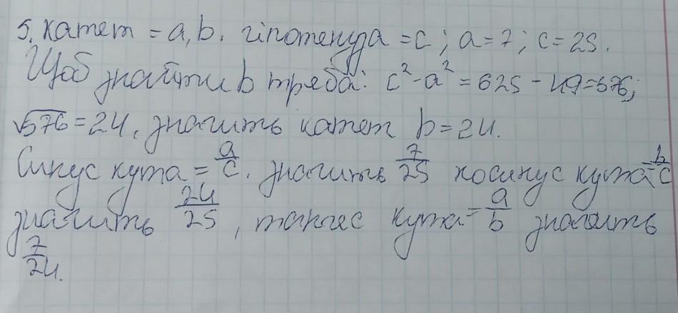 через дано! катеті гіпотенуза прямокутного трикутника пропорційні числа 7 і 25. зайдіть синус косинус, тангес гострих кутів трикутника