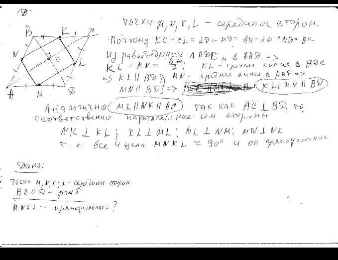 Доведіть що чотирикутник вершини якого є серединами сторін ромба прямокутник.