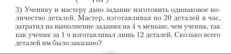 Пускай x - время, которое затратил ученик на выполнение задания. Если мастер затратил на задание на 4 ч меньше чем ученик, значит можем написать что x-4 - время, которое затратил мастер.