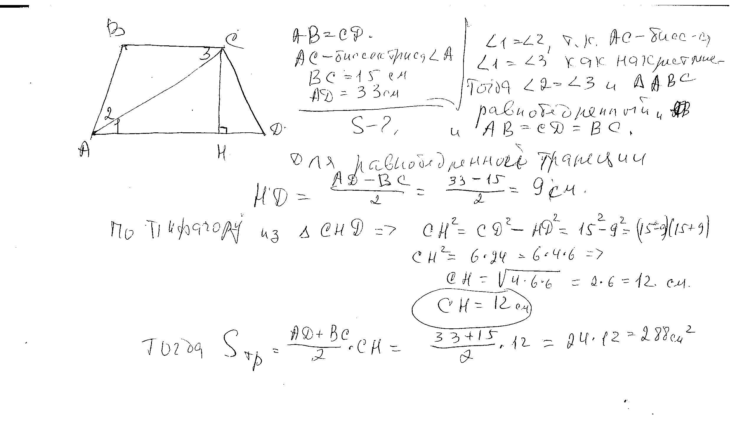 Основи рівнобедреної трапеції дорівнюють 15 см і 33см, а діагоналі є бісектрисами гострих кутів.Обчисліть площу трапеції