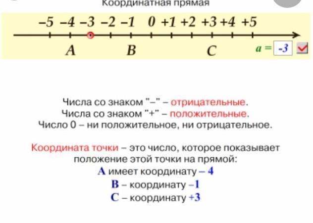 Точка O(0) — начало отсчёта. Справа от неё отмечают положительные числа, а слева — отрицательные числа. Стрелочка указывает положительное направление отсчёта на координатной прямой.Каждой точке на координатной прямой отвечает действительное число, и каждое действительное число отмечается в виде точки на координатной прямой.