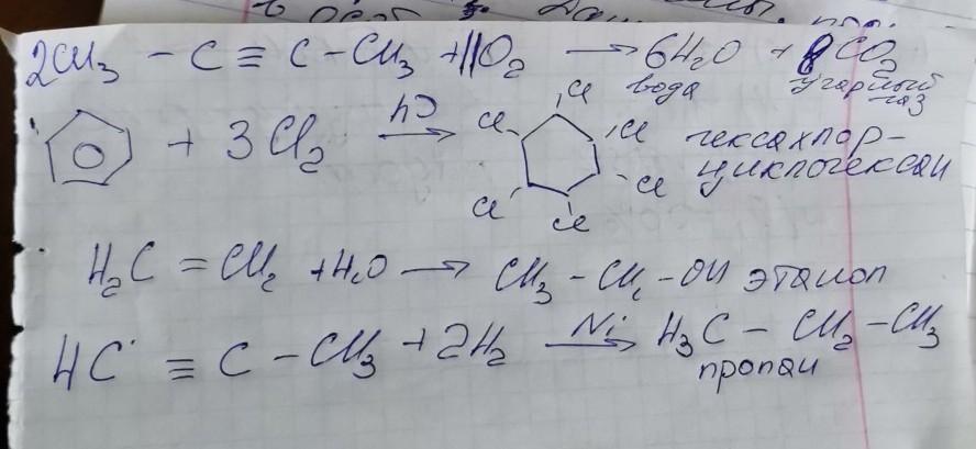 А) С 4Н 6 + О 2 = Б) С 6Н 6 + 3Сl 2 = В) С 2Н 4 + Н 2О = Г) С 3Н 4 + 2Н2 =