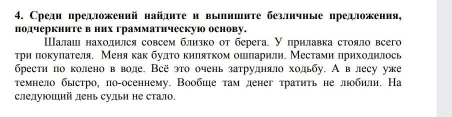 Шалаш находился (подлеж. + сказ.) совсем близко от берега. У прилавка стояло всего три покупателя (подлеж. + сказ.). Меня как будто кипятком ошпарили (кто? - они, неопределенно-личное). Всё это очень затрудняло ходьбу. Вообще там денег тратить не любили (кто? - они, неопределенно-личное).