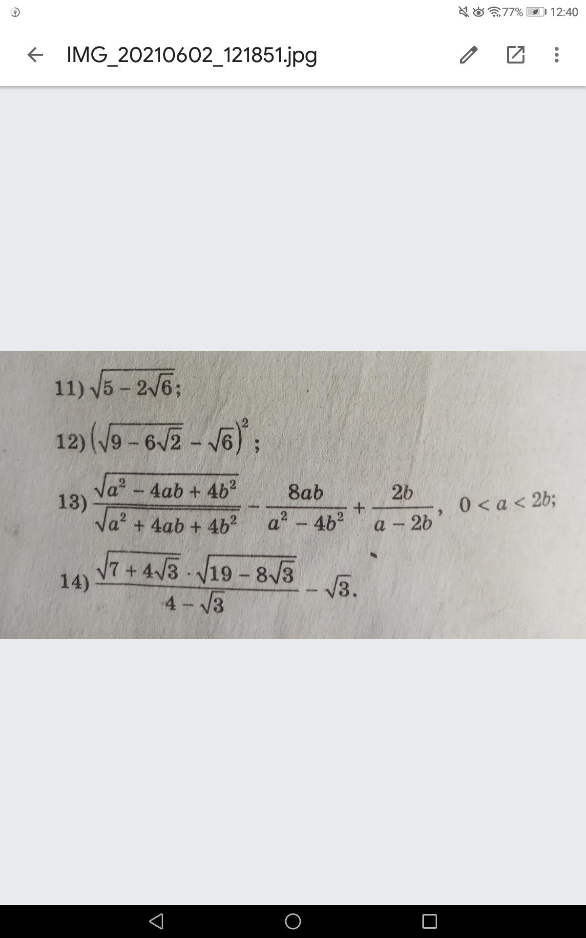 11)\sqrt{5-2\sqrt{6} } =\sqrt{3-2\sqrt{6}+2 }=\sqrt{(\sqrt{3})^{2} -2\cdot\sqrt{3}\cdot\sqrt{2}+(\sqrt{2} )^{2}}=\\\\=\sqrt{(\sqrt{3} -\sqrt{2})^{2}}=|\sqrt{3}-\sqrt{2}|=\boxed{\sqrt{3} -\sqrt{2}}\\\\\\12)(\sqrt{9-6\sqrt{2}}-\sqrt{6})^{2} }=\Big(\sqrt{9-6\sqrt{2} }\Big)^{2}-2\cdot\sqrt{9-6\sqrt{2}}\cdot\sqrt{6}+(\sqrt{6})^{2}=\\\\=|9-6\sqrt{2}|-2\cdot\sqrt{3}\cdot\sqrt{3-2\sqrt{2} }+6=9-6\sqrt{2}-2\sqrt{3} \cdot\sqrt{(\sqrt{2}-1)^{2}} +6=