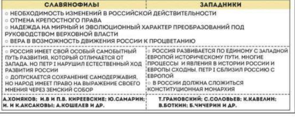 Западники настаивали на обязательной отмене крепостного права и поощрении использования наемного труда, что должно было ускорить развитие России в экономическом плане. Славянофилы высказывались за отмену крепостного права, но при сохранении привычного уклада крестьянской жизни – общинного строя.