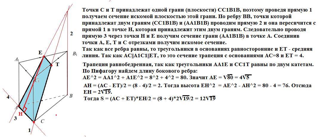 Дана правильная треугольная призма АВСА1В1С1, все ребра которой равны 8. Т — середина ребра С1В1. Е — середина ребра А1В1. Постройте сечение призмы плоскостью ТЕС и найдите его площадь