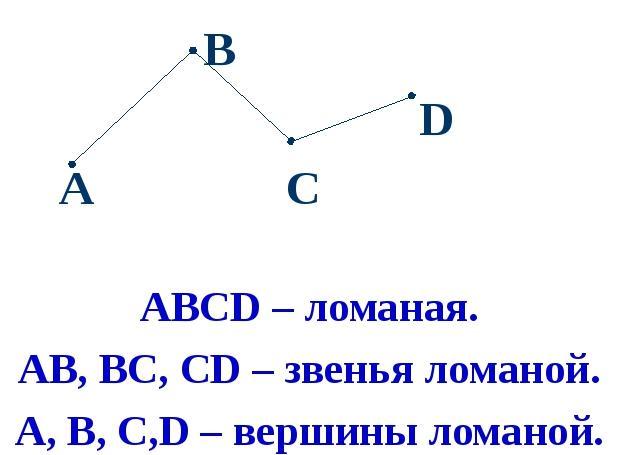 Любая ломаная линия состоит из отрезков, которые называются звеньями. Так как конец одного отрезка является одновременно началом следующего, то концы этих звеньев (или отрезков) называются вершинами ломаной линией.