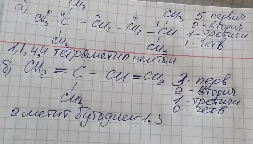 Напишите в развёрнутом виде структурные формулы следующих углеводородов и назовите их по рациональной номенклатуре и номенклатуре ИЮПАК. Укажите сколько первичных, вторичных, троичных и четверичных углеродных атомов в каждом соединении: а) (CH3)3C(CH2)2CH(CH3)2 б) CH2C(CH3)CHCH2