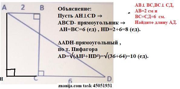 АВ|ВС,ВС|СД,АВ=2 см и ВС=СД=6 см.Найдите длину АД.
