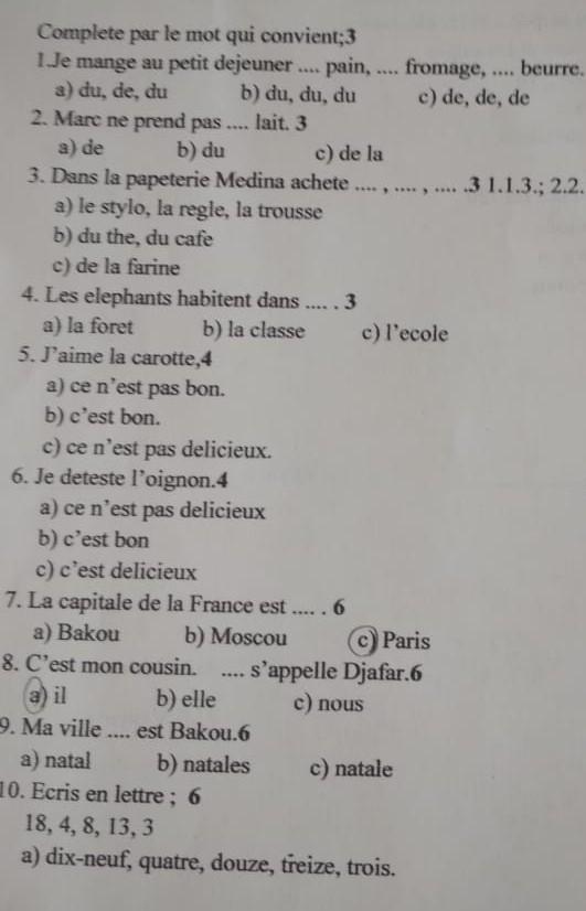 1. b 2.b 3.a 4.a 5.b 6.a 7.c 8.a 9.c 10. dix-huit, quatre,treize,trois(по-ищи схожий ответ на второй странице)