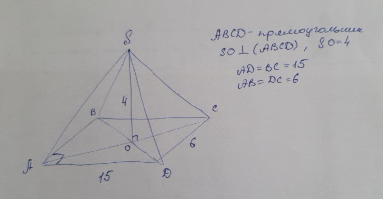 Основанием пирамиды служит прямоугольник со сторонами 6 и 15 см. Высота равна 4 см. и проходит через точку пересечения диагонали основания. Найти объём пирамиды. Решите срочно , очень прошу!!