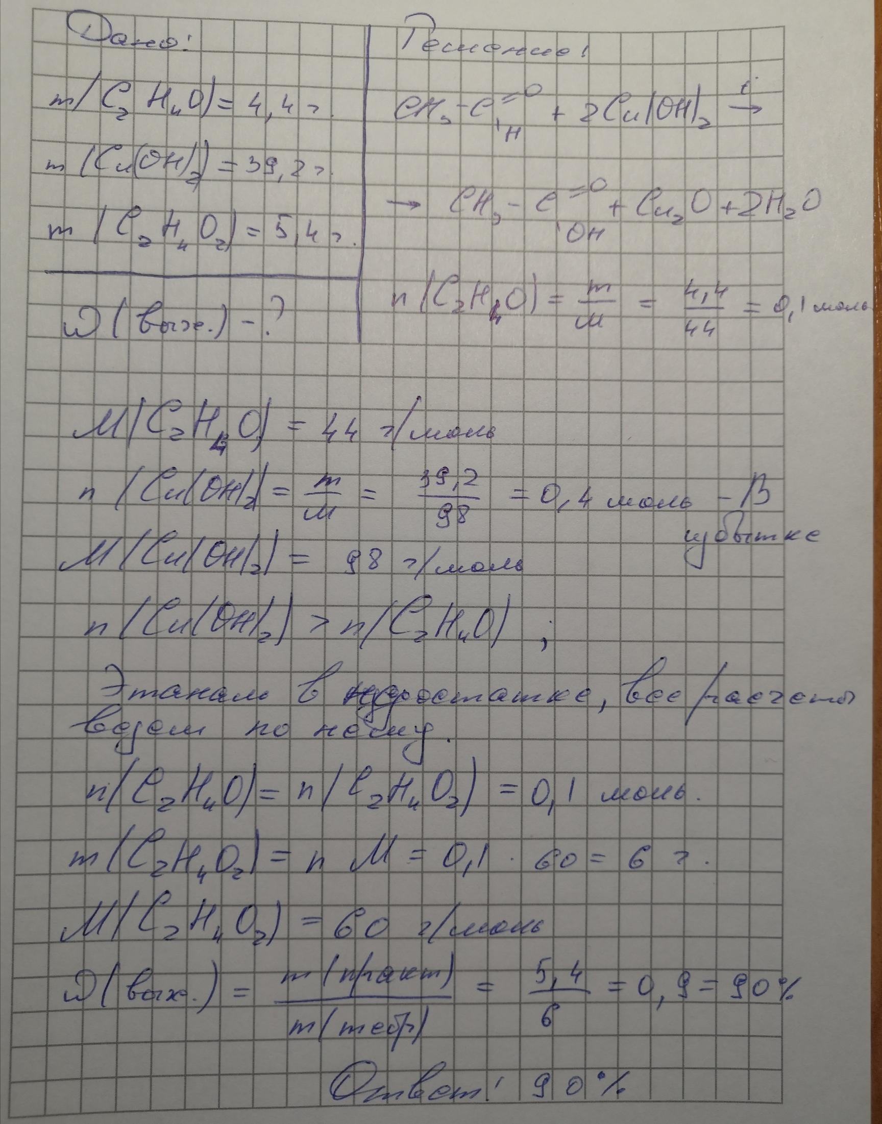 При взаимодействии 4,4 г этаналя и 39,2 г гидроксида меди (II) получили 5,4 г