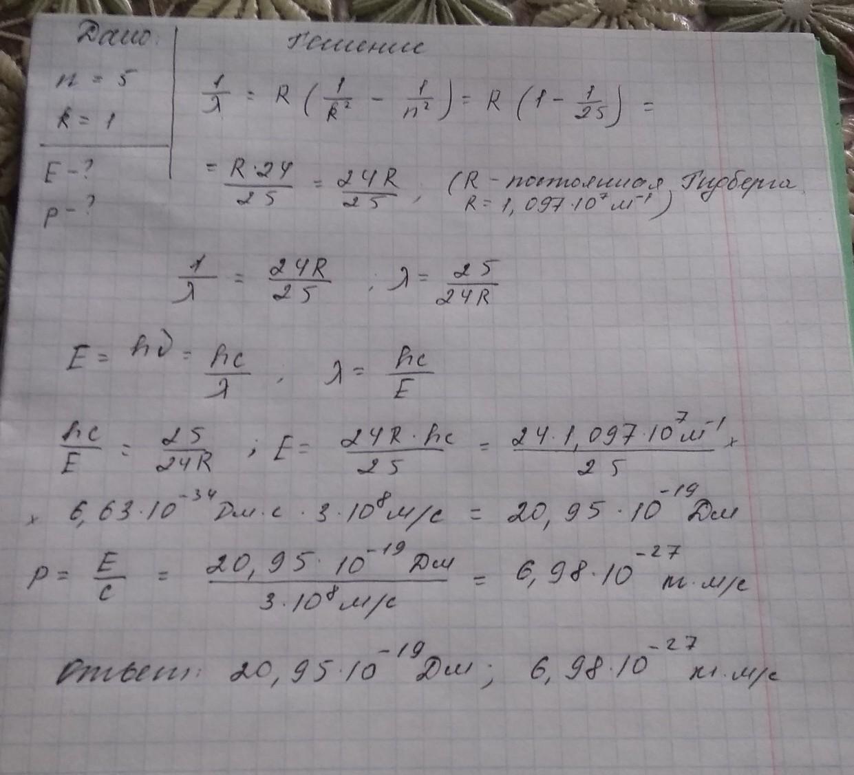 В атоме молока электрон движется с пятой орбиты на первую. Определите энергию и импульс фотона, испускаемого в это время.