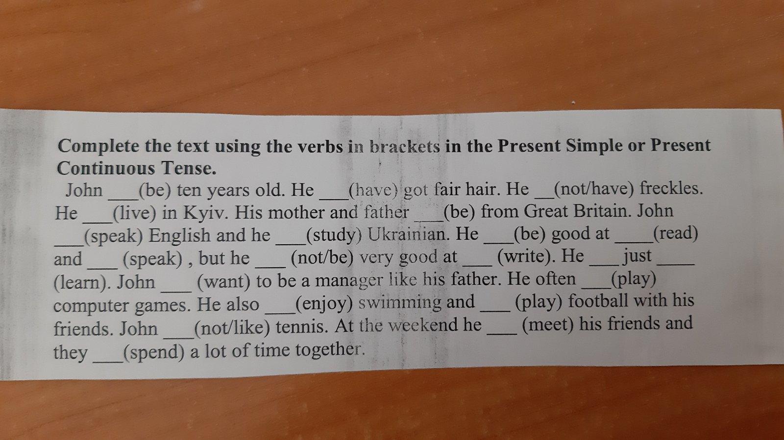 Complete the text using the verbs in brackets in the Present Simple or Present Continuous Tense. John (be) ten years old. He (have) got fair hair. He (not/have) freckles. He _(live) in Kyiv. His mother and father (be) from Great Britain. John _(speak) English and he _(study) Ukrainian. He (be) good at (read) and (speak), but he (not/be) very good at (write). He just (learn). John (want) to be a manager like his father. He often (play) computer games. He also (enjoy) swimming and (play) football with his friends. John (not/like) tennis. At the weekend he (meet) his friends and they (spend) a lot of time together. В скобках надо поменять текст