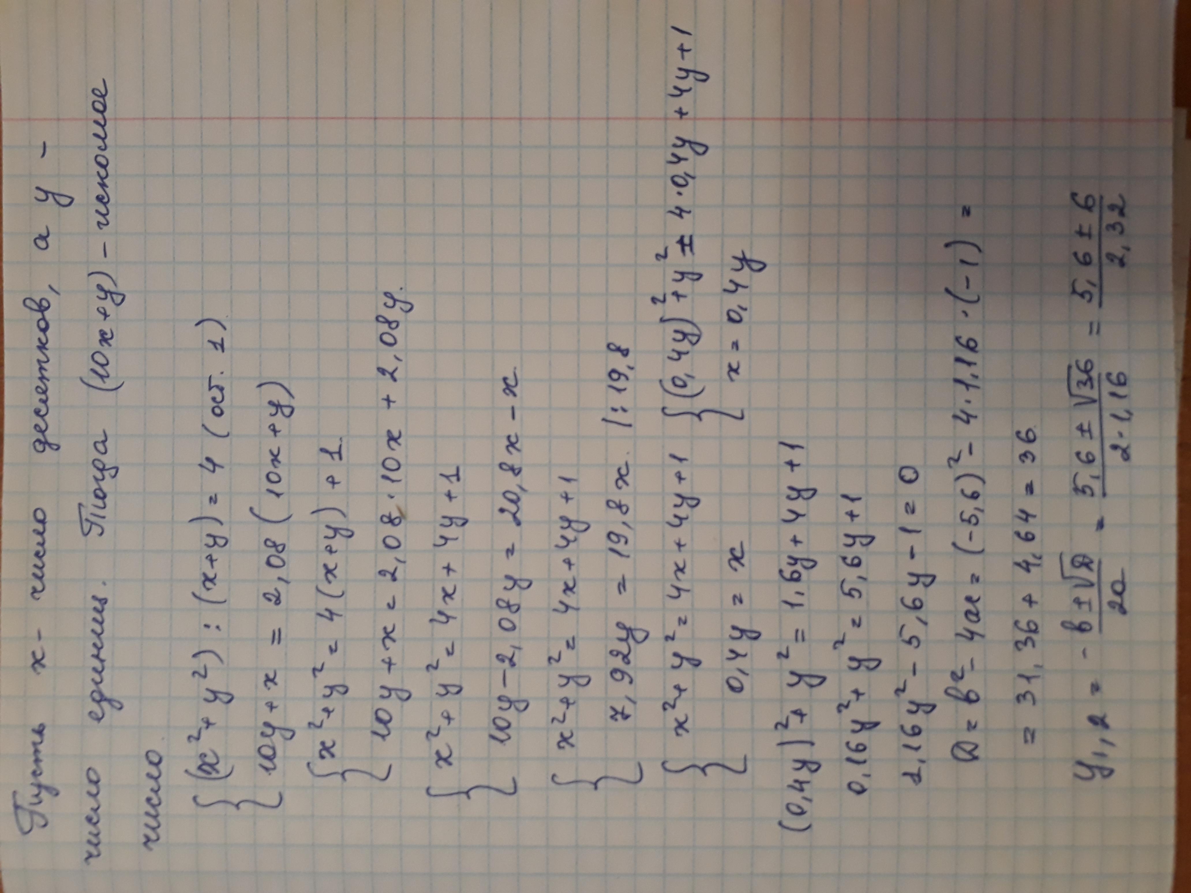 Дано двухзначное число. Если сумму квадратов его цифр разделить на сумму его цифр, то получится 4 и в остатке 1. Число, записанное теми же цифрами в обратном порядке, составляет 208% данного числа. Найдите данное число.