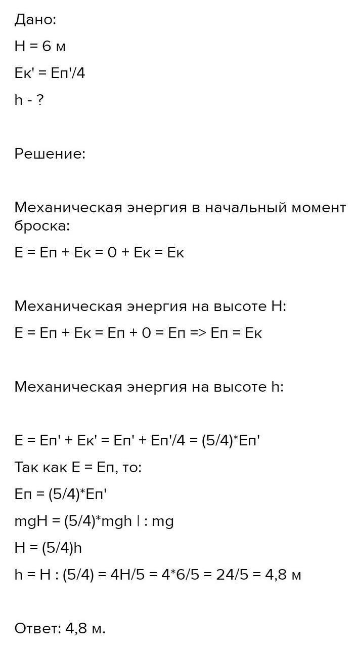На какой высоте потенциальная энергия больше кинетической в 4 раза, брошенного вертикально вверх на высоту 6 м (сопротивление воздуха не учитывать)?