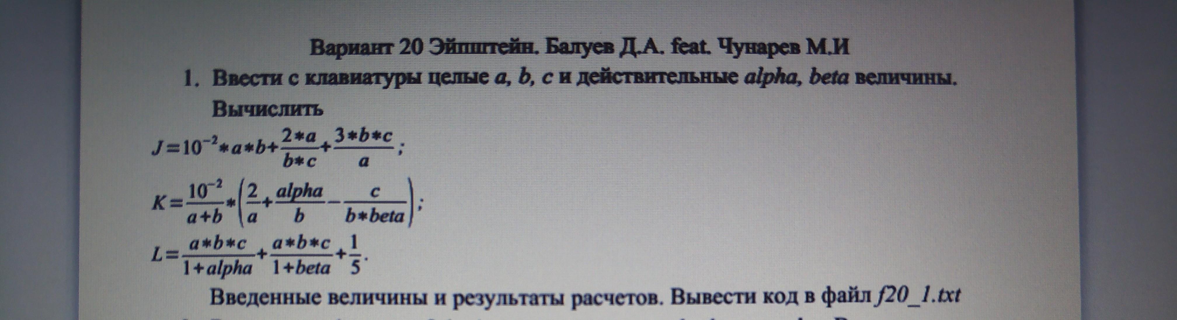 float L = (a * b * c) / (1 + alpha) + (a * b * c) / (1 + beta) + 1 / 5;