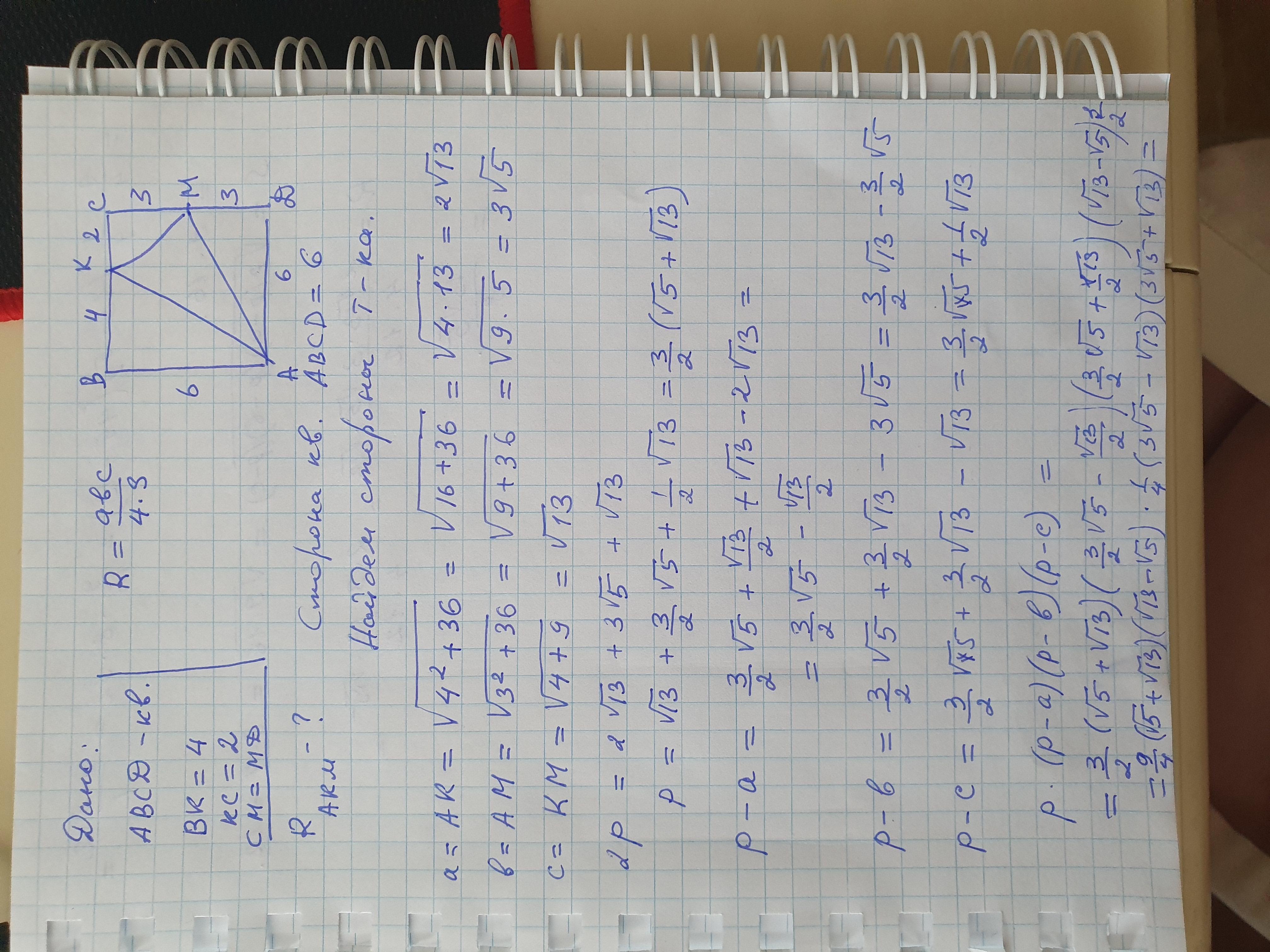 Срочно,пожалуйста! В квадрате ABCD на стороне BC отмечена такая точка K, что BK=4, KC=2, M - середина DC. Найдите радиус окружности, проходящий через точки А, К и М.