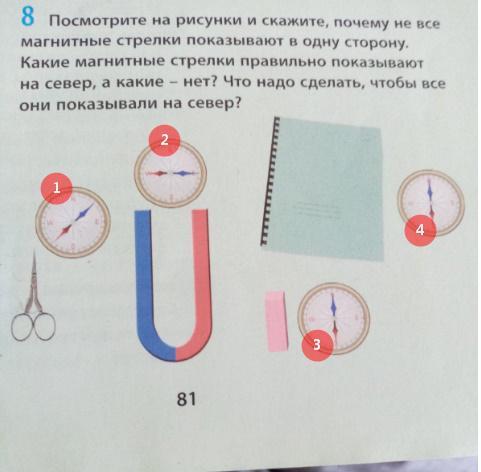 стрелки 1 и 2 показывают не на север потому что на них действует магнитная сила. чтобы они стали показывать на север нужно убрать магнит.
