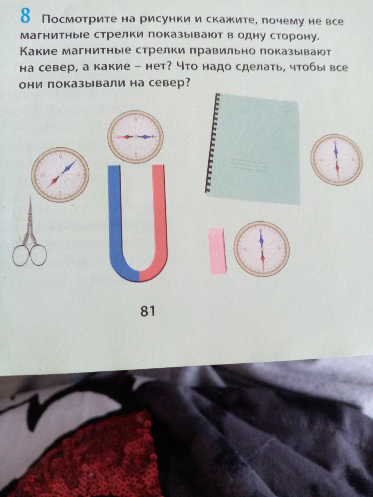 посмотрите на рисунки и скажите почему не стрелки показывают в одну сторону . какие магнитные стрелки правильно показываютна север. а какие нет. что надо сделать, чтобы все они показывали на север