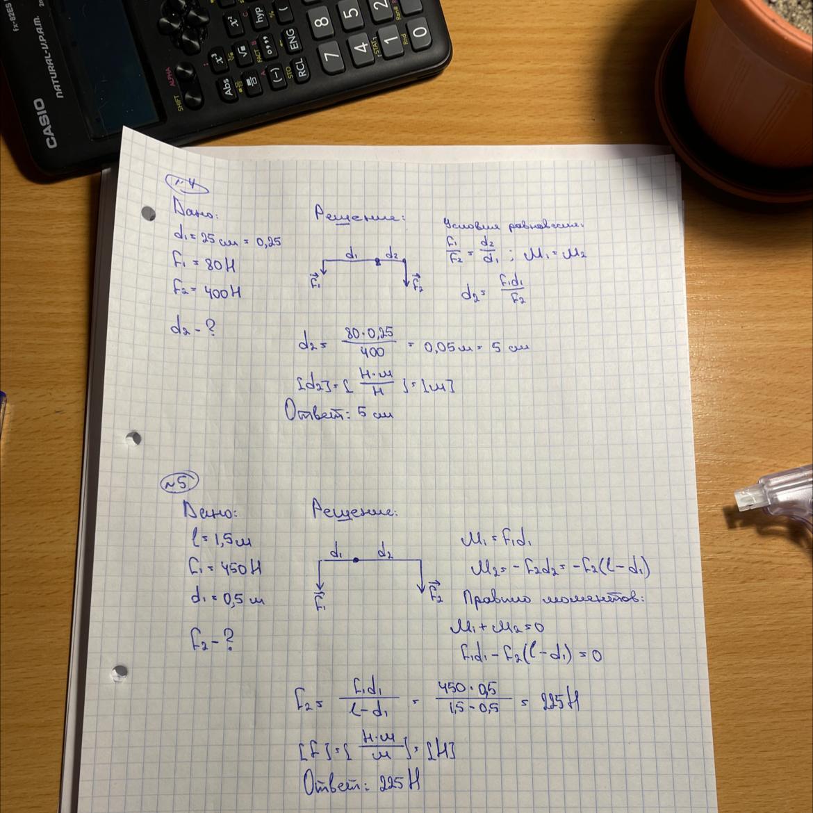 5. С помощью стержня длиной 1,5 м приподнимали шкаф весом 450 Н, который опирался на него так, что плечо этой силы было равно 0,5 м. Какой силой пришлось действовать на другой конец стержня?