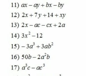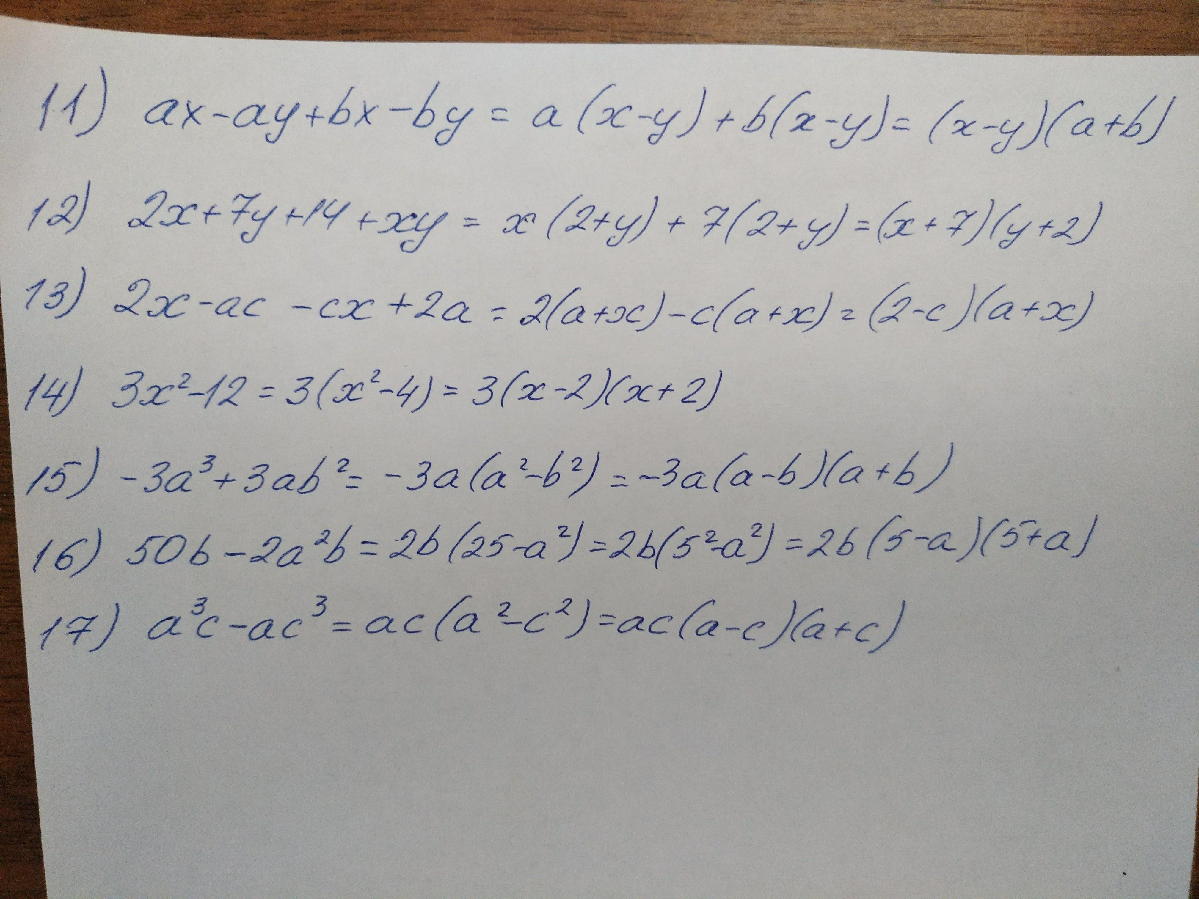 11) ax - ay + bx - by = (ax - ay) + (bx - by) = a(x - y) + b(x - y) = (x - y)(a + b)
