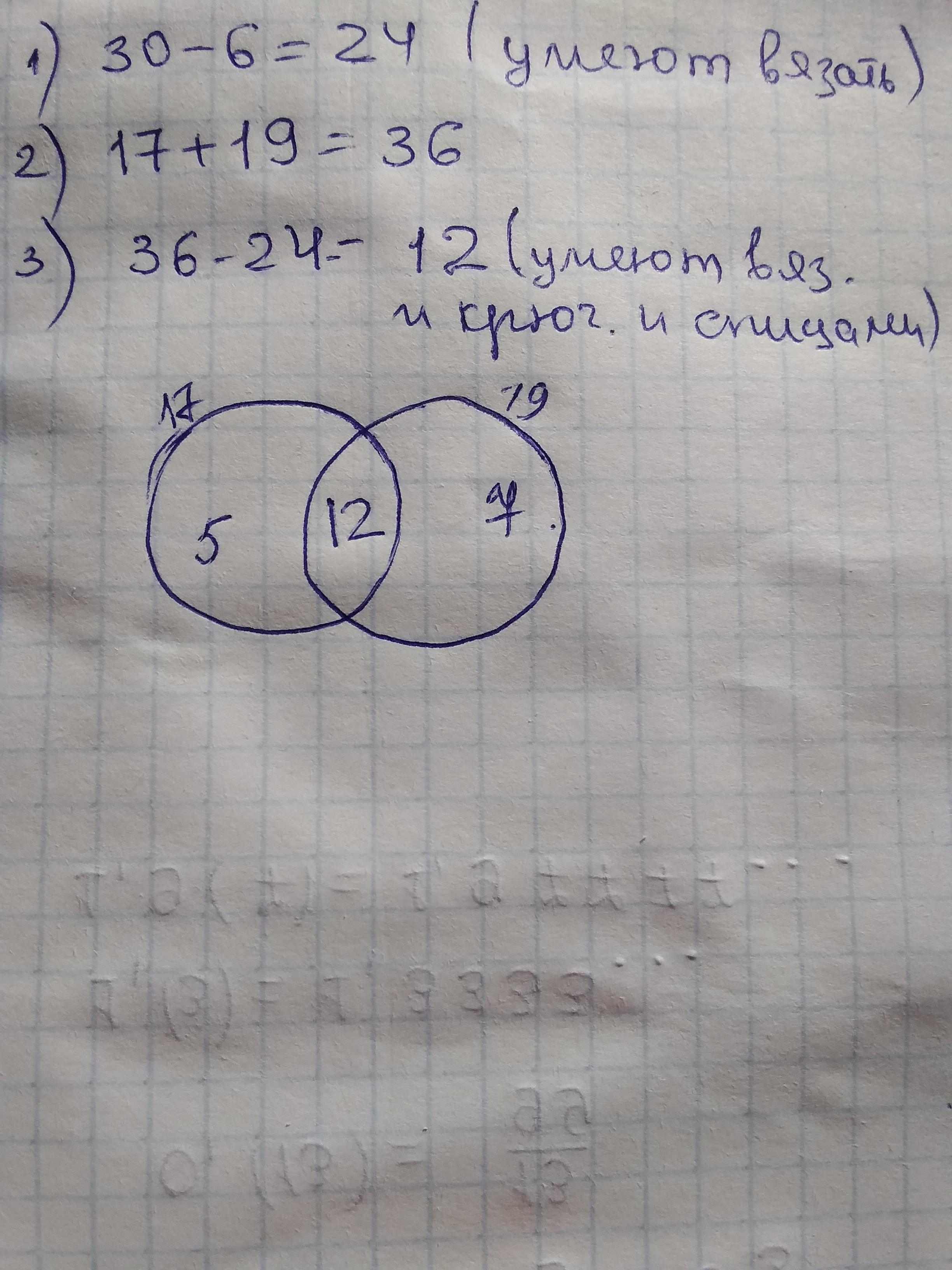 в группе 30 студентов и все девушки. Из них 6 человек не умеют вязать ни крючком ,ни спицами. 17 студенток умеют вязать крючком, 19 вязать спицами .Сколько студента группы умеет вязать и крючком и спицами?