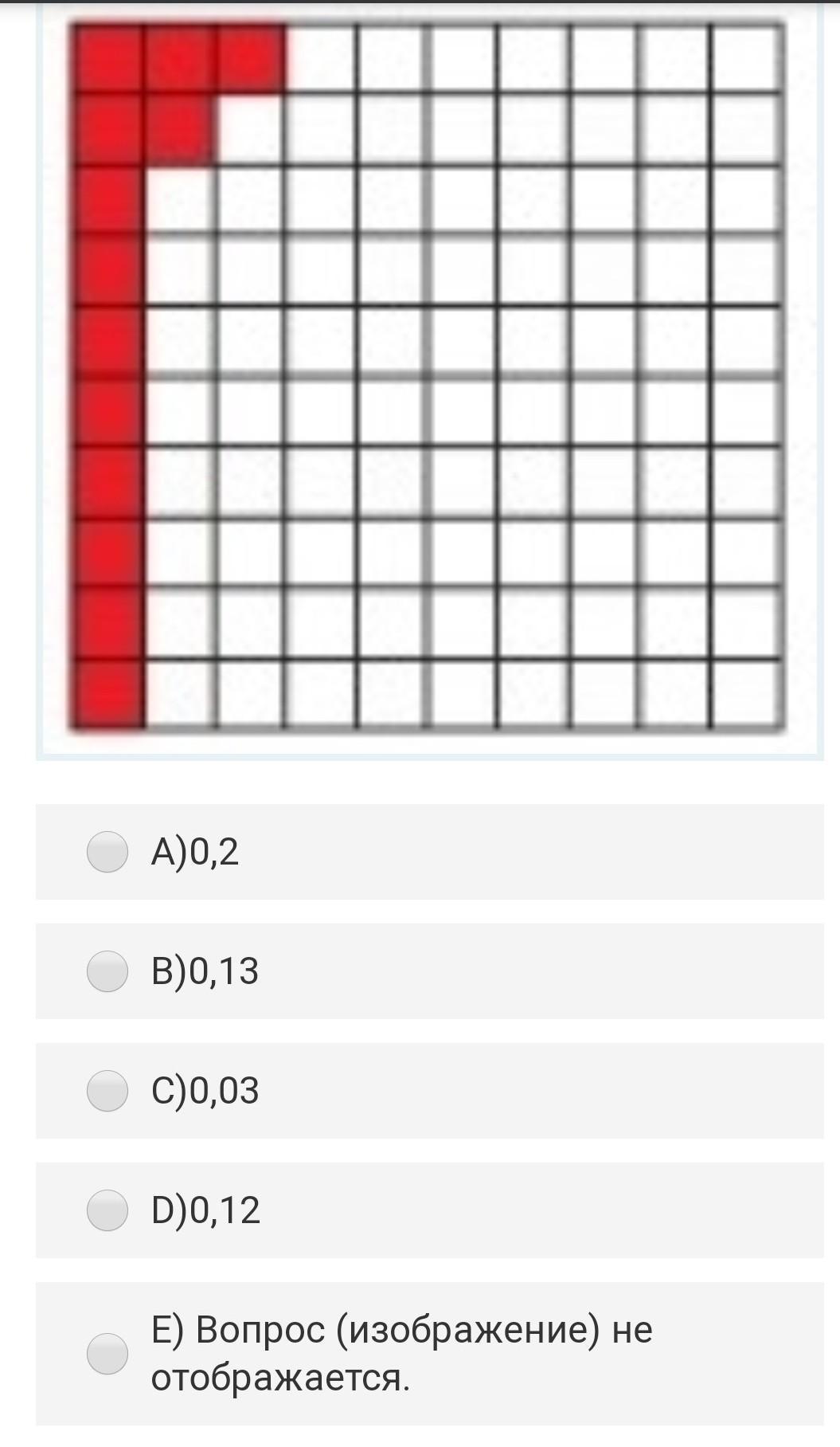 На фото изображено всего 100 квадратов, закрашенных - 13. Чтобы найти часть окрашенной части нужно закрашенные кубики разделить на общее количество их: 13 : 100 = 0,13.