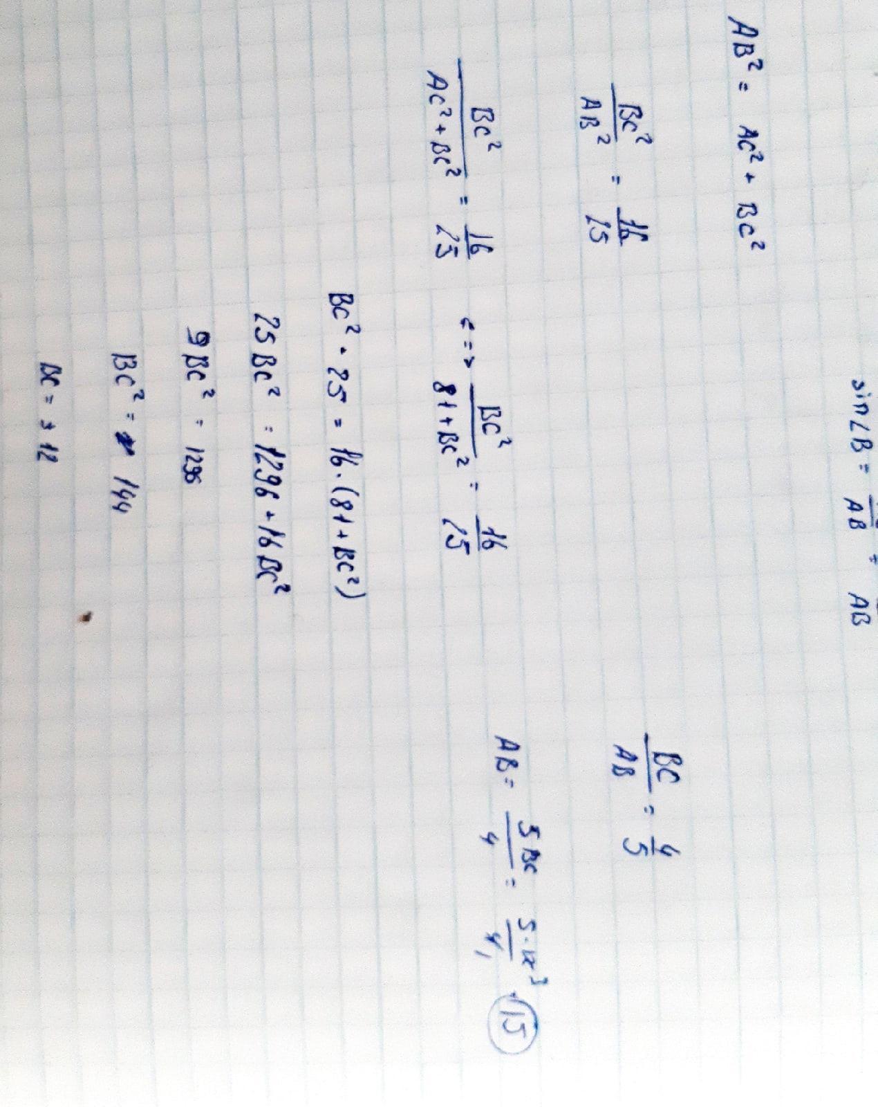 посмотрите там синус равен 4:5, а друг. катет =9=3*3, это треугольник строен на 3,4,5, ВС=4*3=12, АС= 5*3=15