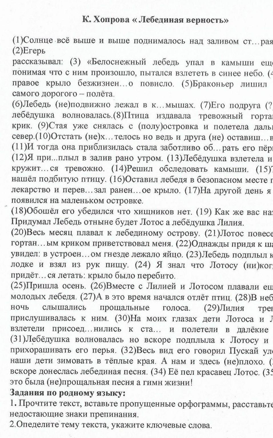 1) Солнце все выше и выше поднималось над заливом, стирая тени. (2) Егерь рассказывал: (3) Белоснежный лебедь упал в камыши, еще не понимая, что с ним произошло, пытался взлететь в синее небо. (4) Его правое крыло безжизненно повисло. (5) Браконьер лишил птицу самого дорогого – полета. (6) Лебедь неподвижно лежал в камышах. (7) Его подруга, белая лебедушка, волновалась. (8) Птица издавала тревожный, гортанный крик. (9) Стая уже снялась с полуостровка и полетела дальше, на север. (10) Отстать не хотелось, но ведь и друга не бросишь в беде. (11) И тогда она, приблизившись, стала заботливо обирать его перышки. (12) Я приплыл в залив рано утром. (13) Лебедушка взлетела и стала тревожно кружиться. (14) Решил обследовать камыши. (15) Тут и нашел подбитую птицу. (16) Оставил лебедя в безопасном месте, привез лекарство и перевязал раненое крыло. (17) На другой день я снова появился на маленьком островке. (18) Обошел его, убедился – хищников нет. (19) «Как же вас назвать? – подумал. – Лебедь будет отныне Лотос, а лебедушка – Лилия». (20) Весь месяц плавал к лебединому острову. (21) Лотос повеселел и гортанным криком приветствовал меня. (22) Однажды, придя к шалашу, увидел: в устроенном гнезде лежало яйцо. (23) Лебедь подплыл к моей лодке и взял из рук пищу. (24) Я знал, что Лотосу никогда не придется летать, – крыло было перебито. (25) Пришла осень. (26) Вместе с Лотосом и Лилией плавали еще два молодых лебедя. (27) А в это время начался отлет птиц. (28) В небе всю ночь слышались прощальные голоса. (29) Лилия тревожно прислушивалась к ним. (30) На моих глазах дети Лотоса и Лилии взлетели, присоединились к стае и полетели в далекие края. (31) Лебедушка волновалась, но вскоре подплыла к Лотосу и стала прихорашивать его перья. (32) Весь вид ее говорил: «Пускай улетают наши дети зимовать в теплые края, а нам и здесь неплохо». (33) А вскоре до меня донеслась лебединая песня. (34) Ее пел красавец Лотос. (35) Нет, это была не прощальная песня – гимн жизни!