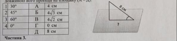 2.Установите соответствие между углами наклона (1-4) отрезка длиной 8 см плоскости и длиной его проекции на плоскость (А-Д)