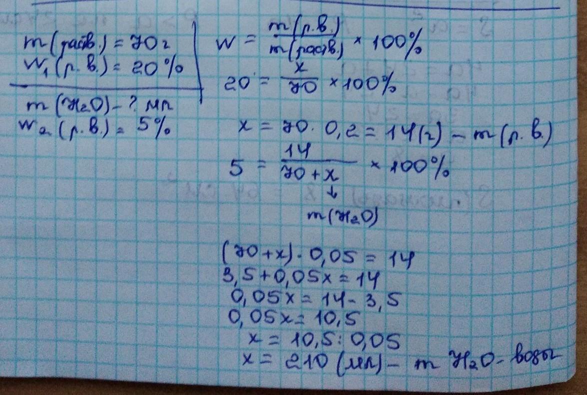 Сколько миллилитров воды необходимо добавить к 70 г 20%-ной азотной кислоты, чтобы получить 5%-ный раствор