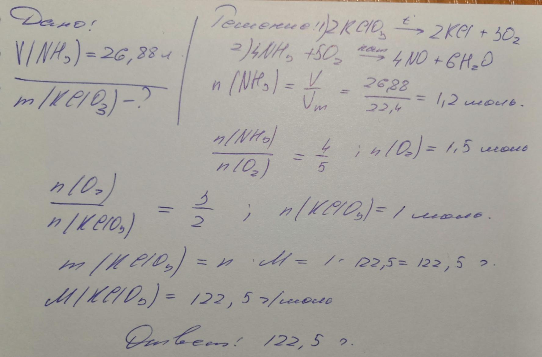 Помогите пжшки ,Какова Масса хлората калия, требующаяся для получения кислорода в объёме, достаточном для окисления аммиака объёмом 26,88 л в присутствии катализатора?