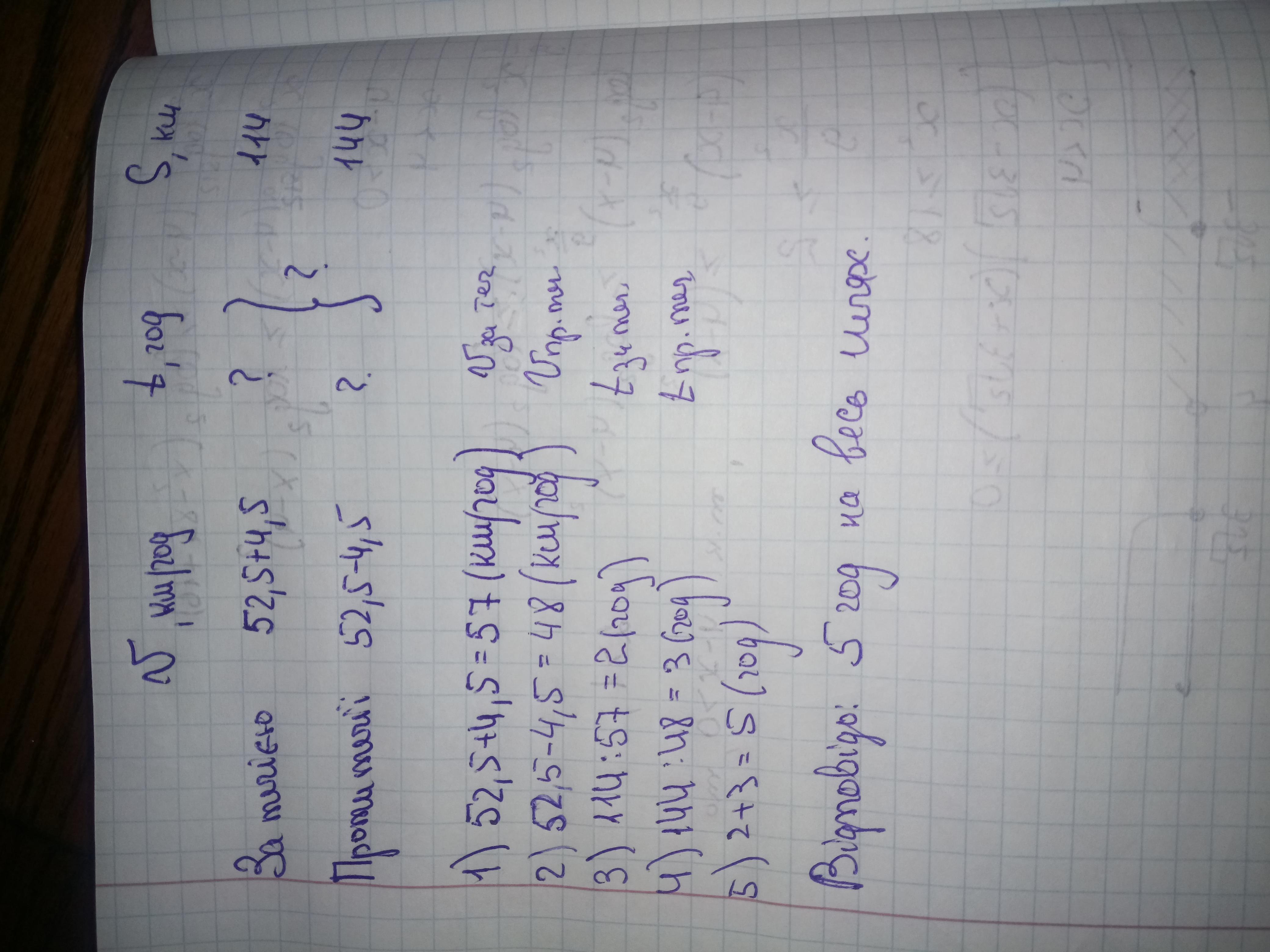 Катер пройшов за течією 114км і проти течії -144км. Скільки часу витратив катер на весь шлях, якщо його власна швидкість 52,5 км/год, а швидкість течії 4,5 км/год?