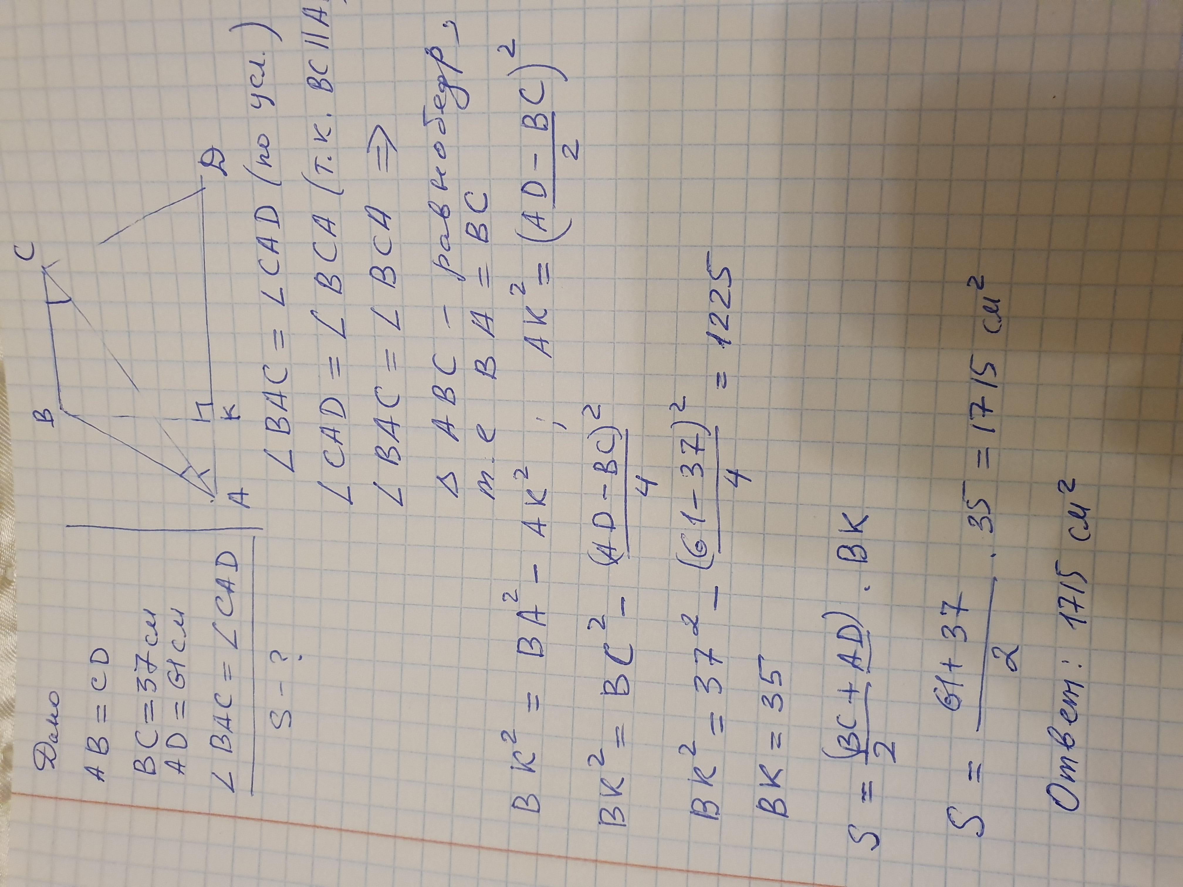 основи рівнобічної трапеції дорівнюють 37 см і 61см, а діагональ ділить її гострий кут навпіл.Знайдіть площу трапеції.(срочно!!!!!)