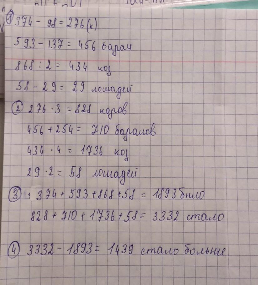 В стаде 374 каровы, 593 барана,868 казы, 58 лошади. Из стада забрали в 1 день 98 каров 137барано половину коз и 29 лошадей.На 2день призкакали в 2 раза больше лошадей, в 4 раза коз ,254 барана и в 3 раза больше коров. Сколько всего животныхна ферме? На сколько больше