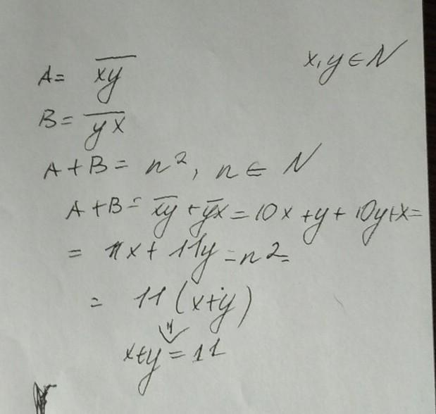 A - двоцифрове число XY. B - також двоцифрове число YX. A+B - квадрат деякого числа. Знайдіть X та Y
