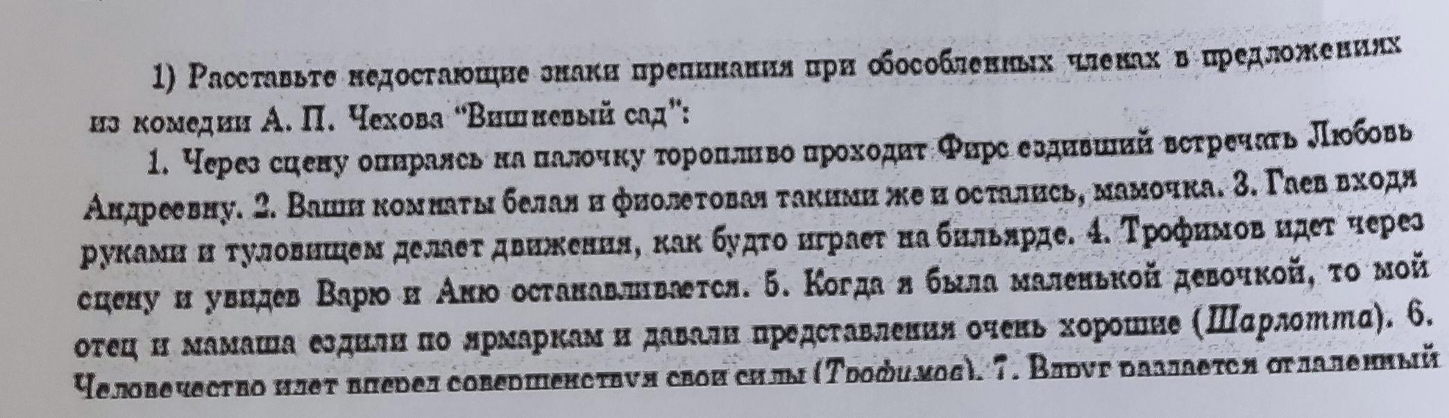 расставьте недостающие знаки препинания при обособленных членах в предложениях из комедии А. П. Чехова "Вишневый сад" 1. Через сцену опираясь ...