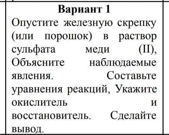 Опустите железную скрепку (или порошок) в раствор сульфата меди (ll) Объясните наблюдаемые явления. Составьте уравнения реакций, Укажите окислитель и восстановитель. Сделайте Вывод.