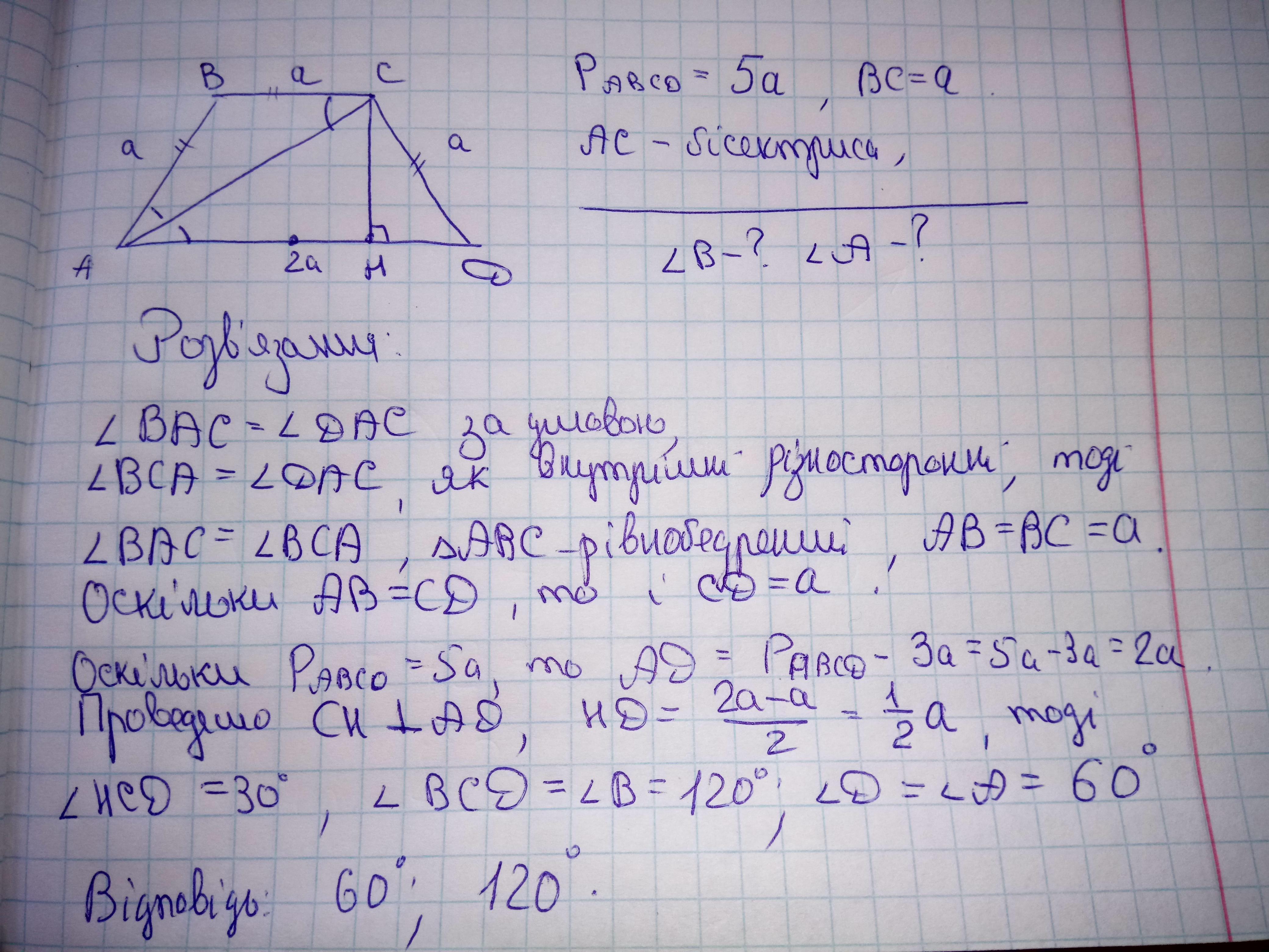 менша основа рівнобічної трапеції=a, діагональ ділить гострий кут цієї трапеції навпіл. Обчислити кут трапеції, якщо її периметр=5a