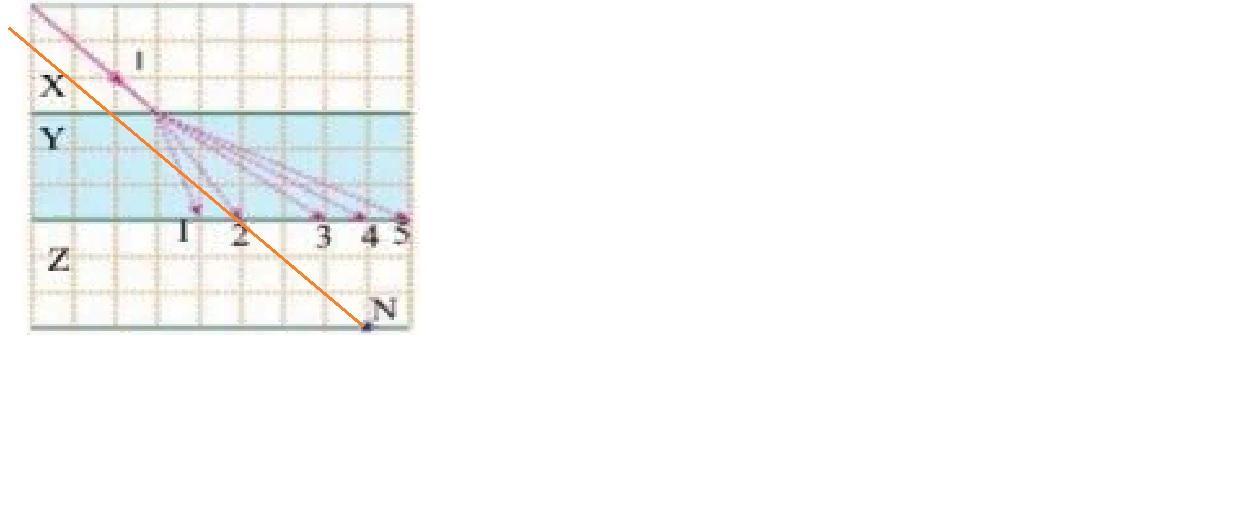 Луч красного цвета I падающий из среды X распространяясь в среде Z по одной из показанных пунктирных линий попадает в точку N. По каким траекториям будут распространяться лучи света 1,2,3,4 и 5 если коэфицент преломления сред X и Z равны (nx=nz)?