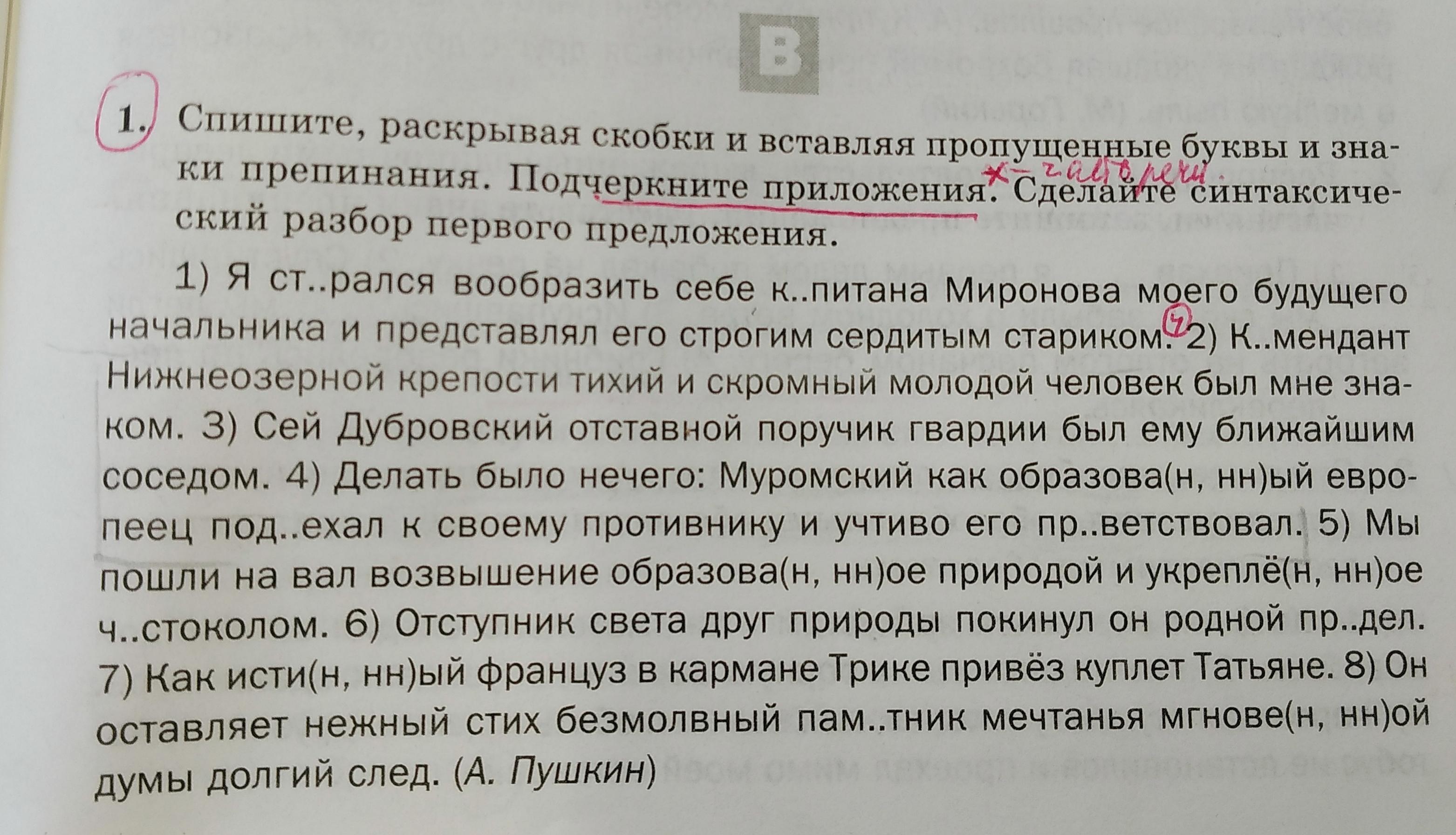 1) Я ст…рался вообразить себе к…питана Миронова моего будущего начальника и представлял его строгим сердитым стариком:2) К…мендант Нижнеозерной крепости тихий и скромный молодой человек был мне знаком. 3) Сей Дубровский отставной поручик гвардии был ему ближайшим соседом. 4) Делать было нечего: Муромский как образова(н, нн)ый европеец под…ехал к своему противнику и учтиво его пр…ветствовал. 5) Мы пошли на вал возвышение образова(н, нн)ое природой и укреплё(н, нн)ое ч…стоколом. 6) Отступник света друг природы покинул он родной пр…дел.