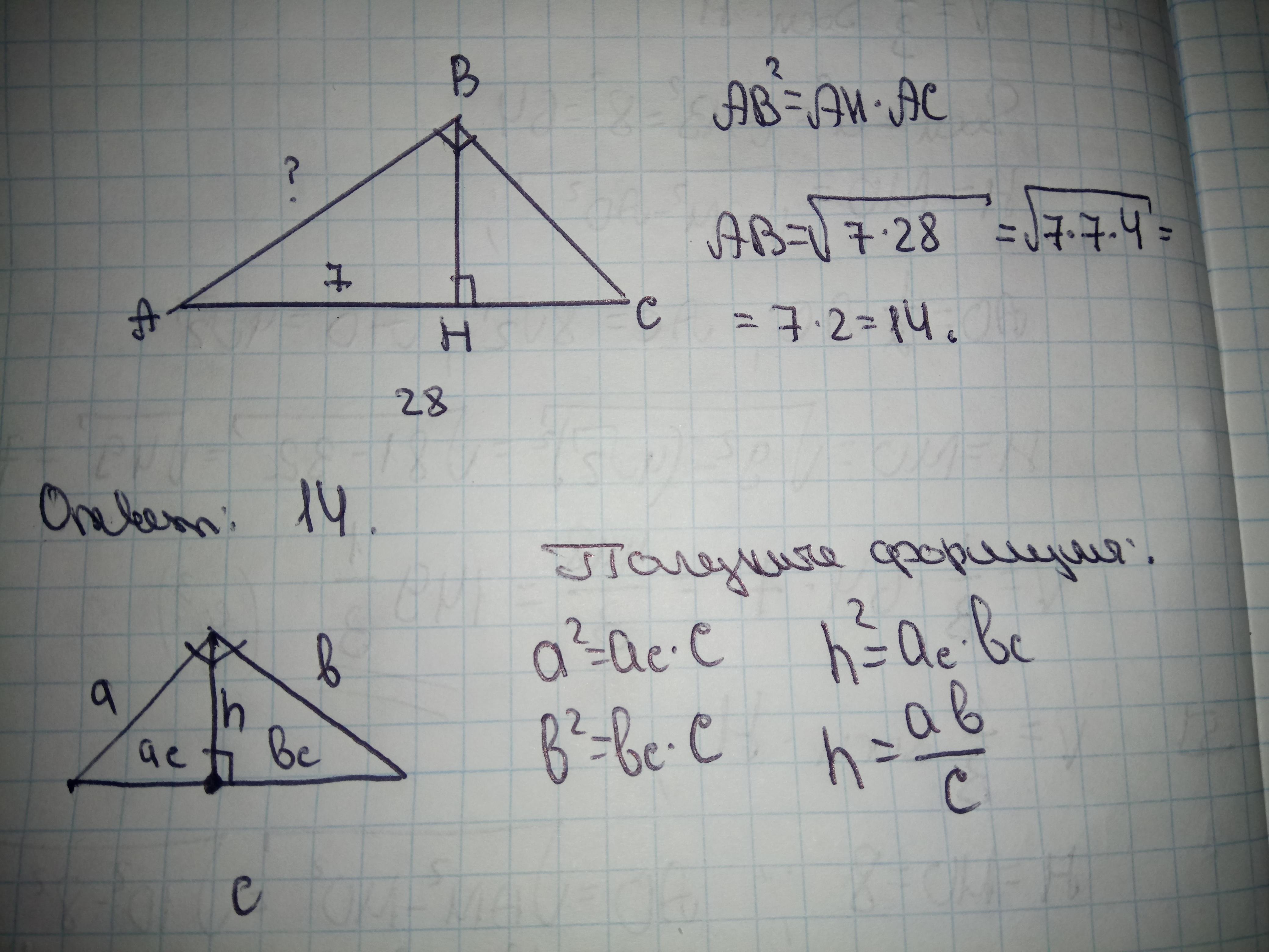 HB = √ ( HA*HC ) = √ (7*21 ) = 7√ 3 .