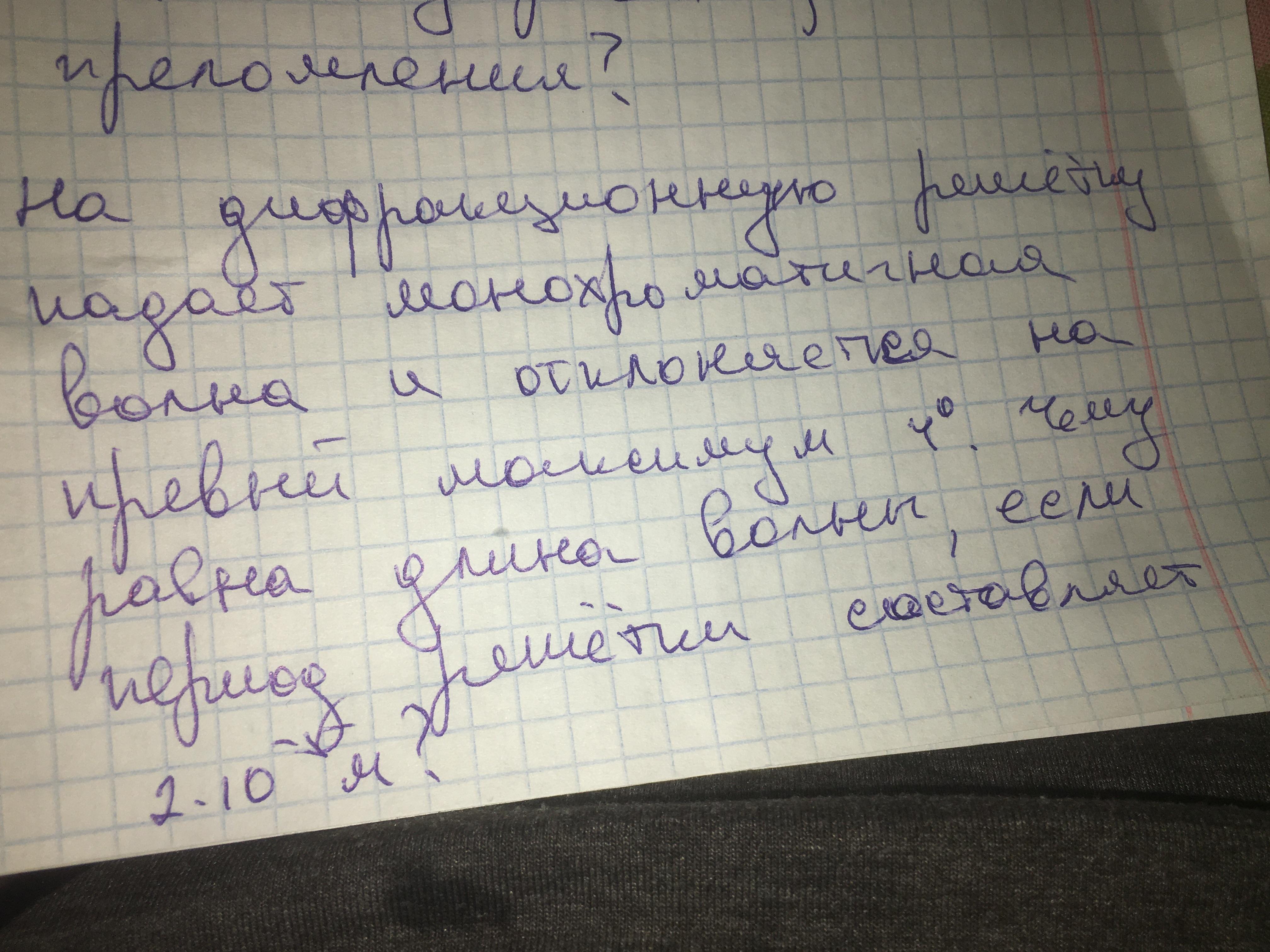 λ = d·sin φ / m = 2·10⁻⁵·sin 4° / 1 ≈ 2·10⁻⁵·0,07 = 1,4·10⁻⁶ м