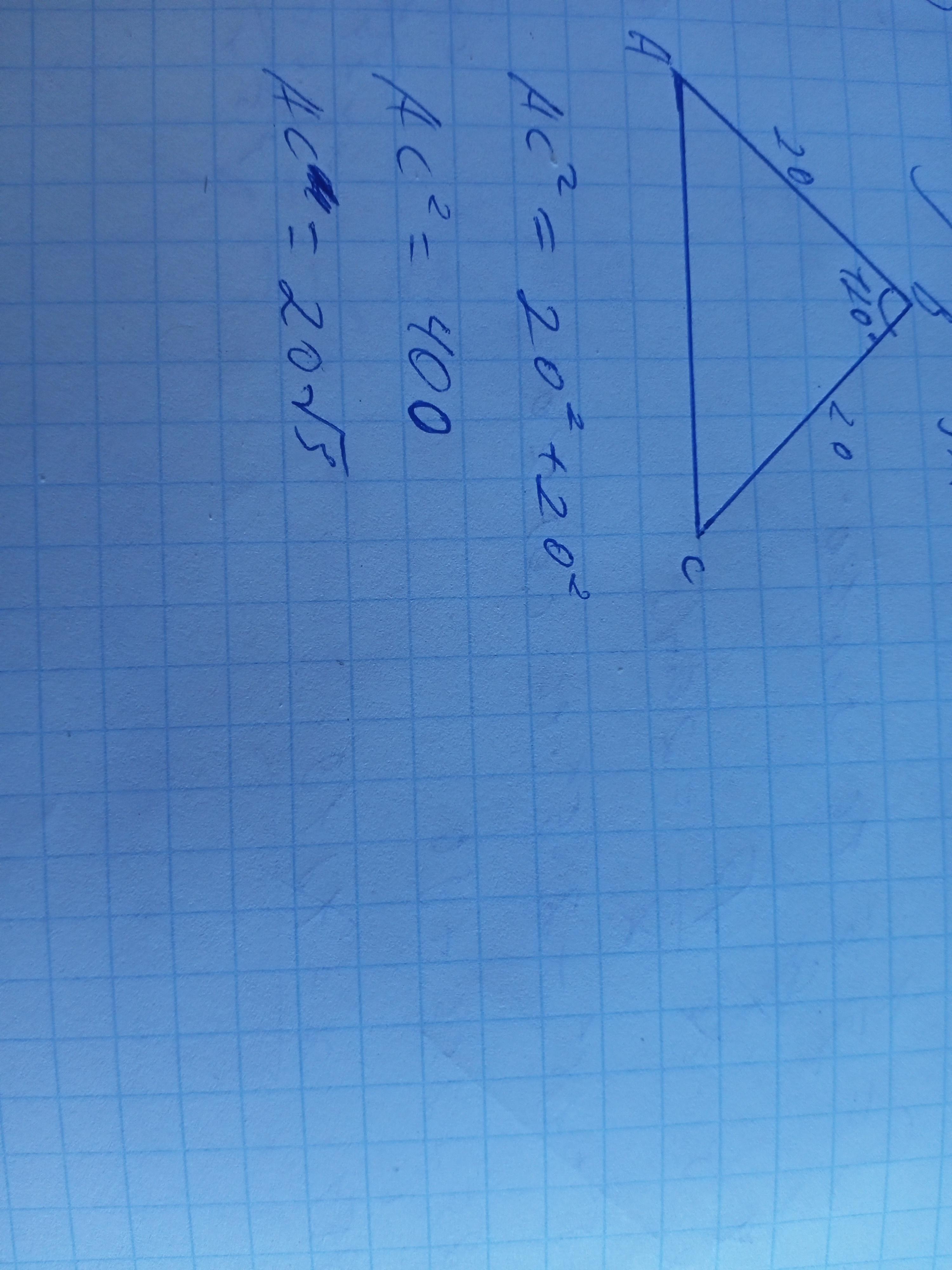AC= √(AB^2+BC^2 - 2*AB*BC*cos120°)