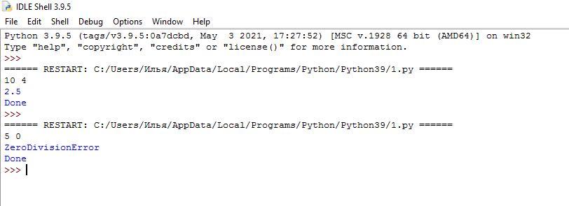 Напишите функцию, которая выполняет деления двух целых чисел (числа вводятся в одной строке через пробел.). Необходимо написать программу, которая запускает эту функцию, и, в случае ошибки (деление на ноль), генерируется исключение ZeroDivisionError и выводит его имя как в исходных данных. В случае успешного действия деления, имеет выводиться результат и сообщение OK. В любом случае в конце работы программы выводится сообщение Done.