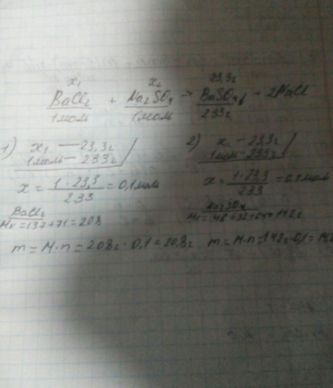 • Вычислим массу хлорида бария и сульфата натрия, необходимую для получения 23,3 грамм сульфата бария: