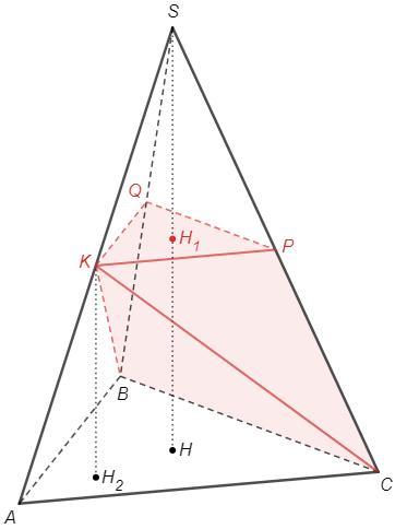 Дана правильная треугольная пирамида SABC, AB = 18, высота SH = 22, точка K - середина AS, точка N - середина BC. Плоскость, проходящая через точку K и параллельная основанию пирамиды пересекает рёбра SB и SC в точках Q и P соответственно. Найдите объем пирамиды KBPQC