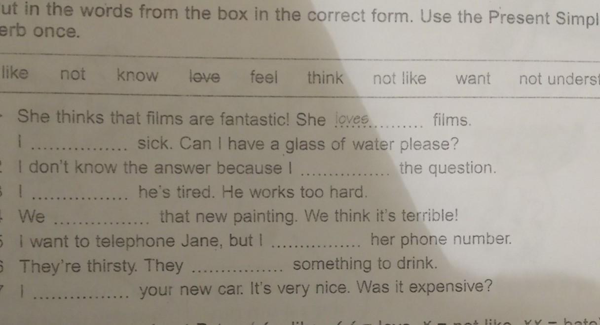 1) feel 2) don't understand 3) think 4) don't like 5) don't know 6) want 7) like